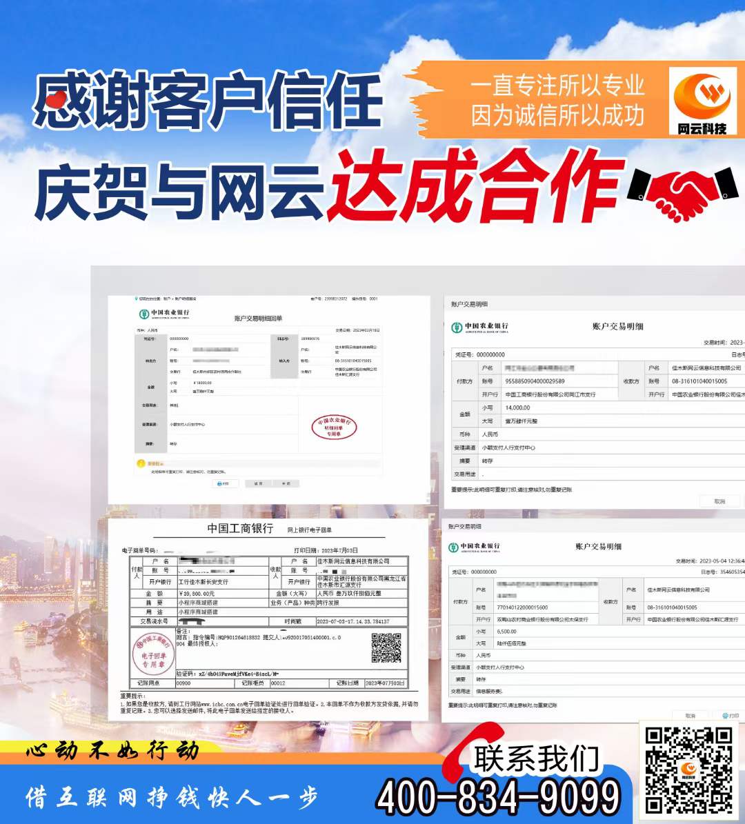 感謝客戶信任,慶賀與網(wǎng)云達成合作?。∫恢睂W⑺詫I(yè),因為誠信所以成功,選擇網(wǎng)云,選擇靠譜,心動不如行動,借互聯(lián)網(wǎng)掙錢快人一步。