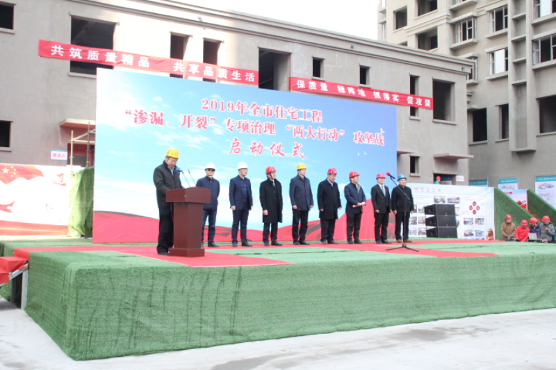 ? ? ? 市住房和城鄉(xiāng)建設(shè)局黨組書記、局長陳勇發(fā)表講話,要求全行業(yè)要堅持從以人民為中心的發(fā)展思想,下大力氣解決群眾居住生活“痛點”,聚焦住宅“滲透、開裂”兩大質(zhì)量問題,以攻山頭炸碉堡的勇氣和決心,采取切實有效的措施,大幅減少兩大隱患。青島一建集團董事長、總裁馬樹軍作為施工企業(yè)的代表發(fā)言,表示將全力投入到這場攻堅戰(zhàn)中,以堅定的決心和必勝的信心,堅決落實攻堅戰(zhàn)的各項任務(wù),堅決奪取攻堅戰(zhàn)的勝利!