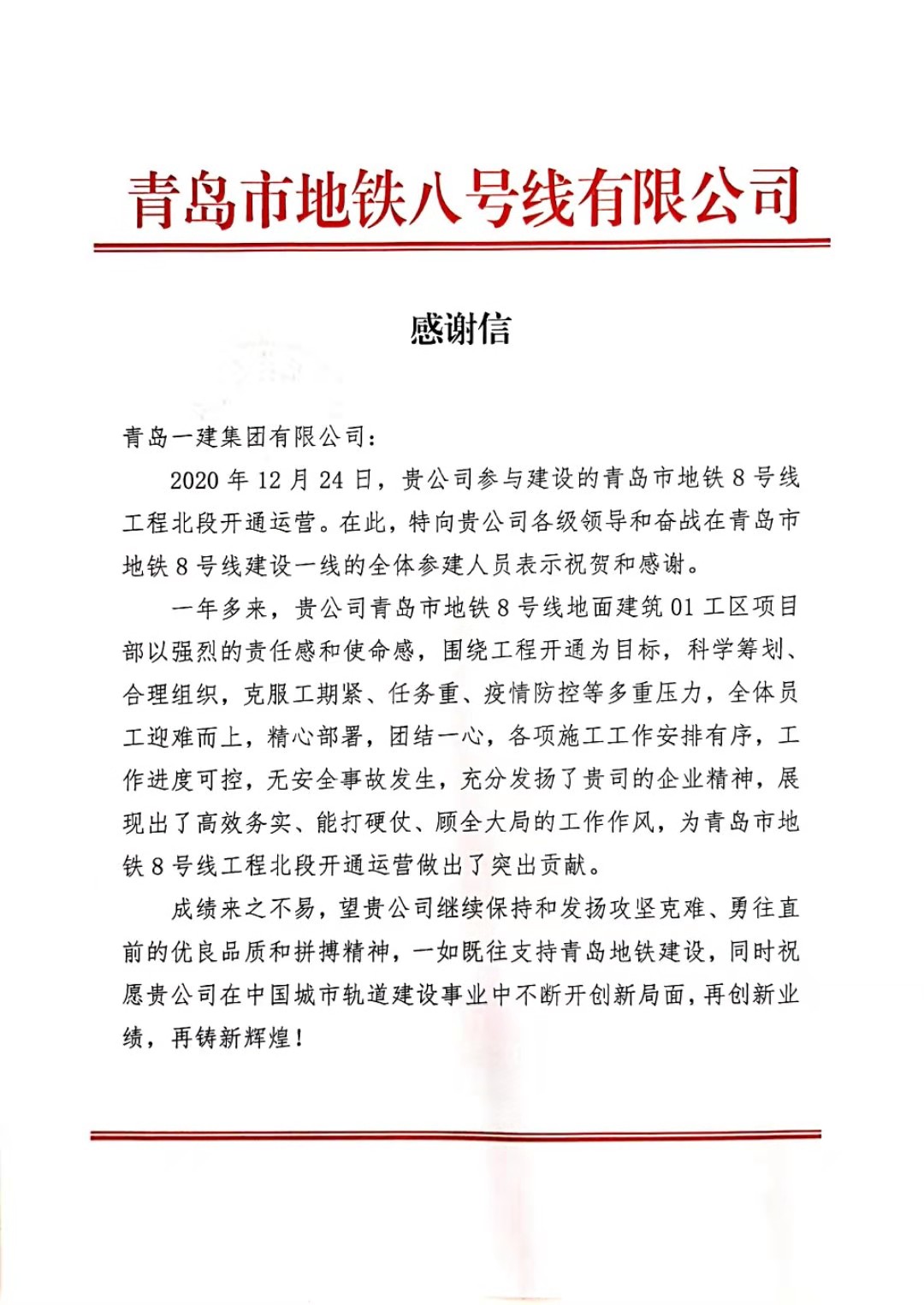 集團(tuán)公司獲青島市地鐵八號線有限公司感謝信