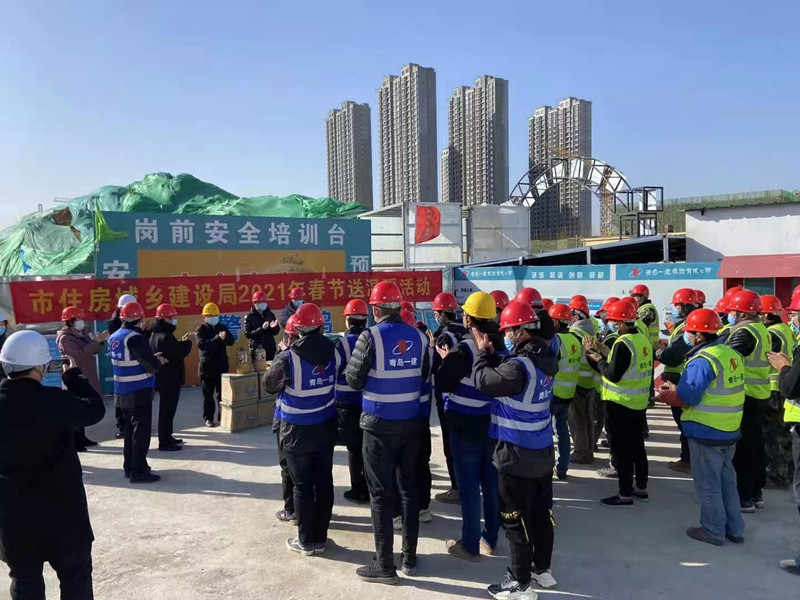 近日,青島市住房城鄉(xiāng)建設(shè)局副局長(zhǎng)蒲一江帶隊(duì)來(lái)到一建集團(tuán)承建的市北區(qū)同安二路小學(xué)項(xiàng)目開(kāi)展春節(jié)前“送溫暖”活動(dòng)。為奮戰(zhàn)在一線的施工人員送上米面油等慰問(wèn)品,向他們長(zhǎng)時(shí)間堅(jiān)守一線,辛苦工作為青島城市發(fā)展作出的貢獻(xiàn)表示感謝,祝愿他們過(guò)一個(gè)幸福美滿的新年。