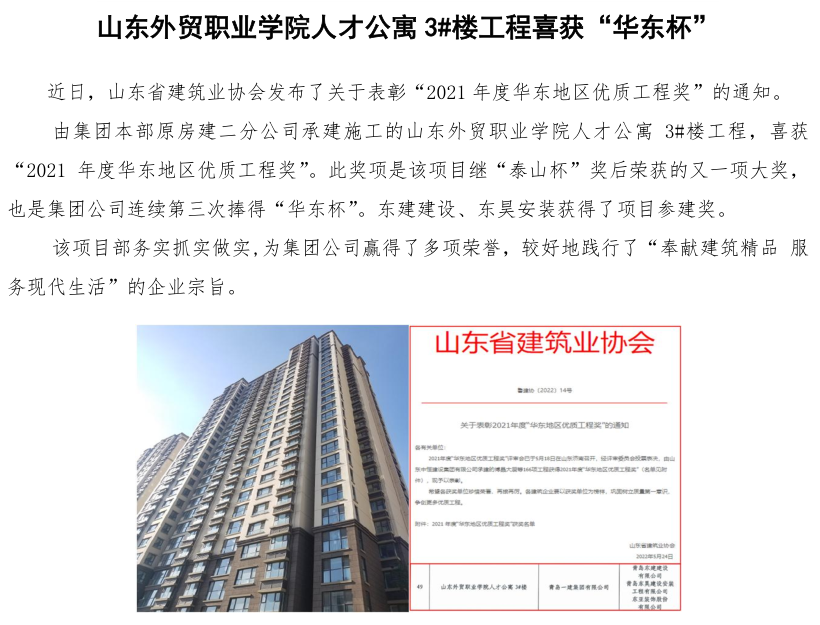 山東外貿(mào)職業(yè)學(xué)院人才公寓3#樓工程喜獲“華東杯”